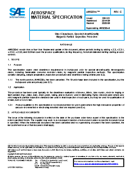 This specification covers steel cleanliness requirements in inch/pound units for special aircraft-quality ferromagnetic steels, including hardenable corrosion resistant steels, by magnetic particle inspection methods. This specification contains sampling, sample preparation, inspection procedures and cleanliness rating criteria (See 8.2).