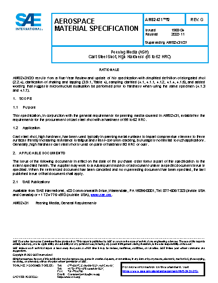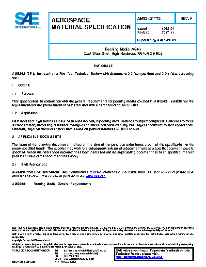 This specification, in conjunction with the general requirements for peening media covered in AMS2431, establishes the requirements for the procurement of cast steel shot with a hardness of 55 to 62 HRC.