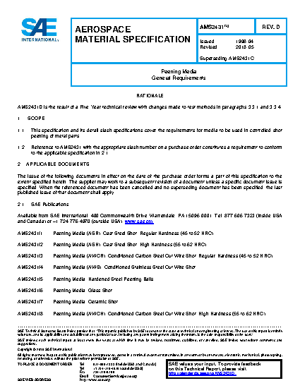 This specification and its detail slash specifications cover the requirements for media to be used in controlled shot peening of metal parts.