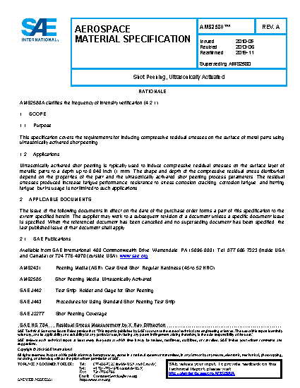 This specification covers the requirements for inducing compressive residual stresses on the surface of metal parts using ultrasonically activated shot peening.