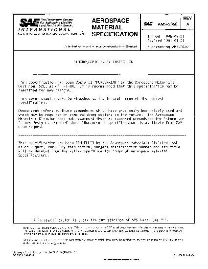 This specification has been declared "NONCURRENT" by the Aerospace Materials Division, SAE, as of 1-1-84. It is recommended that this specification not be specified for new designs. This cover sheet should be attached to the initial issue of the sUbject specification. Noncurrent refers to those procedures which have previously been widely used and which may be required on some existing designs in the future. The Aerospace Materials Division does not recommend these as standard procedures for future use in new designs. Each of these "Noncurrent" specifications is available from SAE upon request. This specification has been CANCELLED by the Aerospace Materials Division, SAE, as of August, 1989. By this action, subject specification number and its title will be deleted from the active specification index of Aerospace Material Specifications.