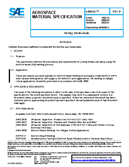 This specification defines the procedures and requirements for joining metals and alloys using the electron-beam (EB) welding process.