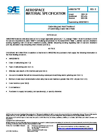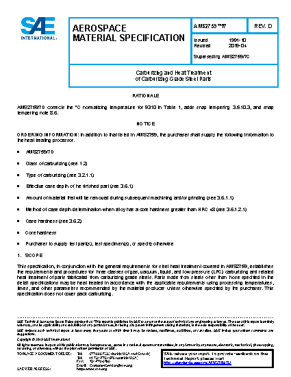 This specification, in conjunction with the general requirements for steel heat treatment covered in AMS2759, establishes the requirements and procedures for three classes of gas, vacuum, liquid, and low pressure (LPC) carburizing and related heat treatment of parts fabricated from carburizing grade steels. Parts made from steels other than those specified in the detail specifications may be heat treated in accordance with the applicable requirements using processing temperatures, times, and other parameters recommended by the material producer unless otherwise specified by the purchaser. This specification does not cover pack carburizing.