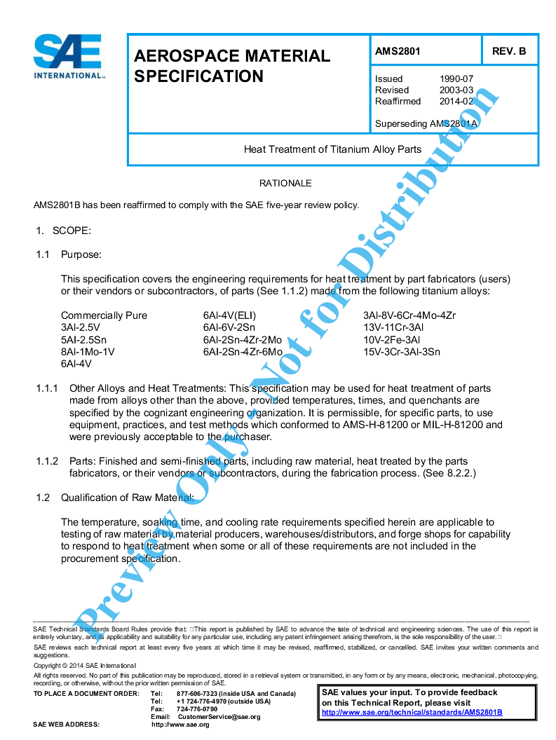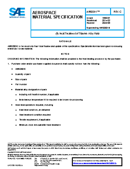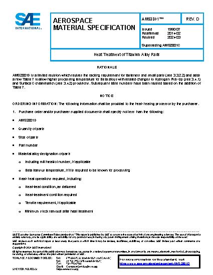 This specification establishes the engineering requirements for the heat treatment of titanium and titanium alloy parts. Heat treatment of raw material by raw material producers, forge shops, or foundries shall be in accordance with the material procurement specification AMS-H-81200.