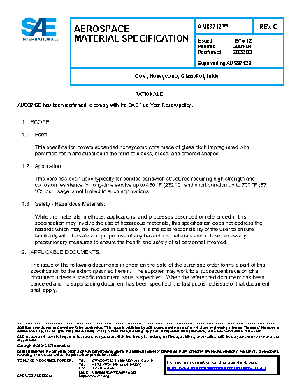 This specification covers expanded honeycomb core made of glass cloth impregnated with polyimide resin and supplied in the form of blocks, slices, and ordered shapes.