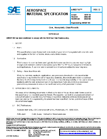 This specification covers honeycomb core made of glass fabric impregnated with phenolic resin and supplied in the form of blocks, slices, and ordered shapes.