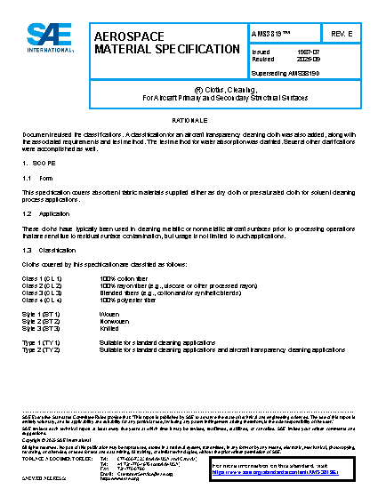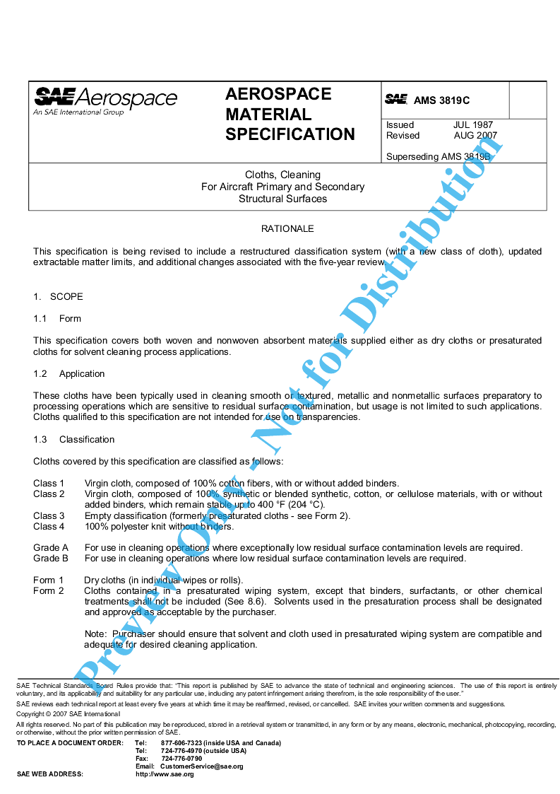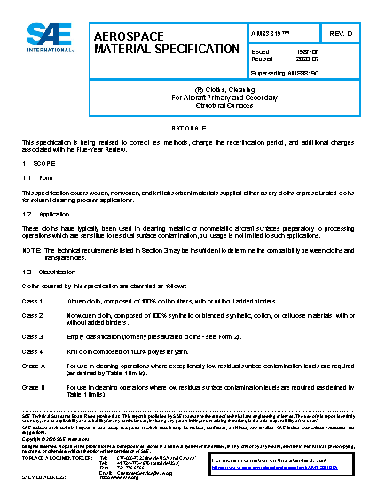 This specification covers both woven and nonwoven absorbent materials supplied either as dry cloths or presaturated cloths for solvent cleaning process applications.