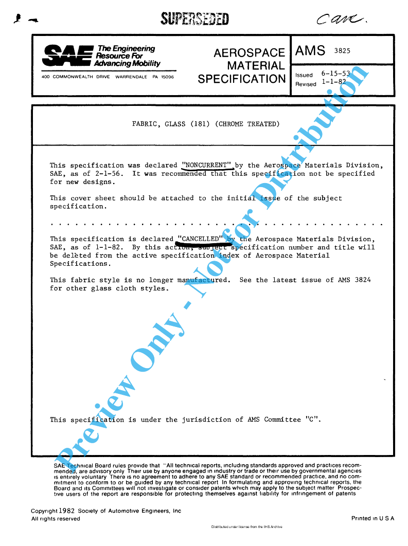 This specification was declared "NONCURRENT"^by the Aerospace Materials Division, SAE, as of 2-1-56. It was recommended that this specification not be specified for new designs. This cover sheet should be attached to the initial issue of the subject specification. This specification is declared J/CANCELLED" by the Aerospace Materials Division, SAE, as of 1-1-82. By this acfflWP^Wfft^c^^pecification number and title will be deleted from the active specification index of Aerospace Material Specifications. This fabric style is no longer manufactured. See the latest issue of AMS 3824 for other glass cloth styles.