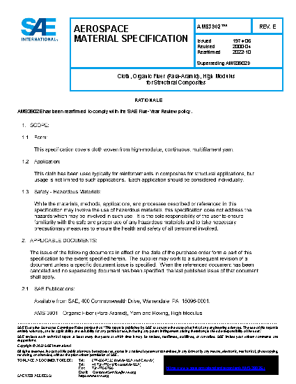 Cloth, Organic Fiver (Para-Aramid), High Modulus For Structural Composites