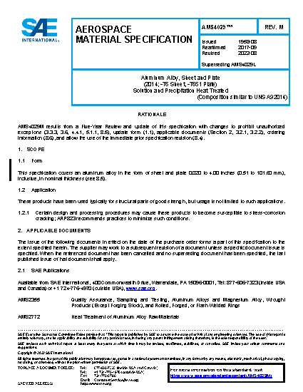 Aluminum Alloy Sheet and Plate (2014; -T6 Sheet, -T651 Plate) Solution and Precipitation Heat Treated