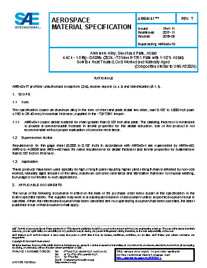 This specification covers an aluminum alloy in the form of sheet and plate alclad two sides, over 0.187 to 1.000 inch (over 4.750 to 25.40 mm) in nominal thickness, supplied in the -T3/-T351 temper.