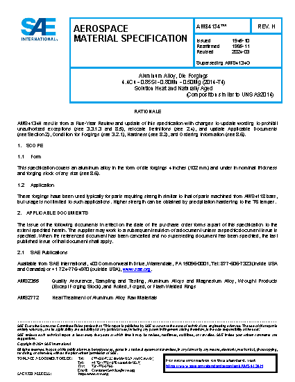 This specification covers an aluminum alloy in the form of die forgings 4 inches (102 mm) and under in nominal thickness, and forging stock of any size (see 8.6).