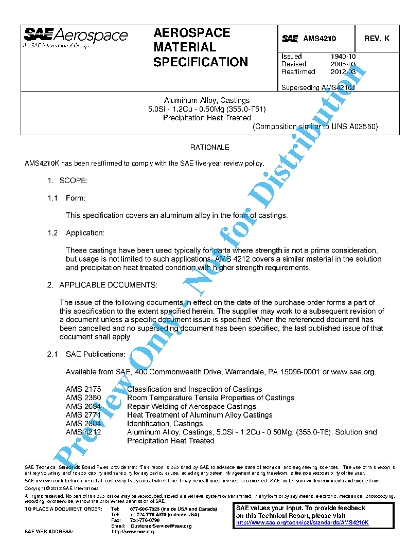 Aluminum Alloy, Castings 5.0Si - 1.2Cu - 0.50Mg (355.0-T51) Precipitation Heat Treated