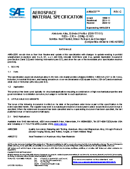 Aluminum Alloy, Extruded Profiles (7055-T77511) 8.0Zn - 2.3Cu - 2.0Mg - 0.16Zr Solution Heat Treated, Stress Relieved, and Overaged