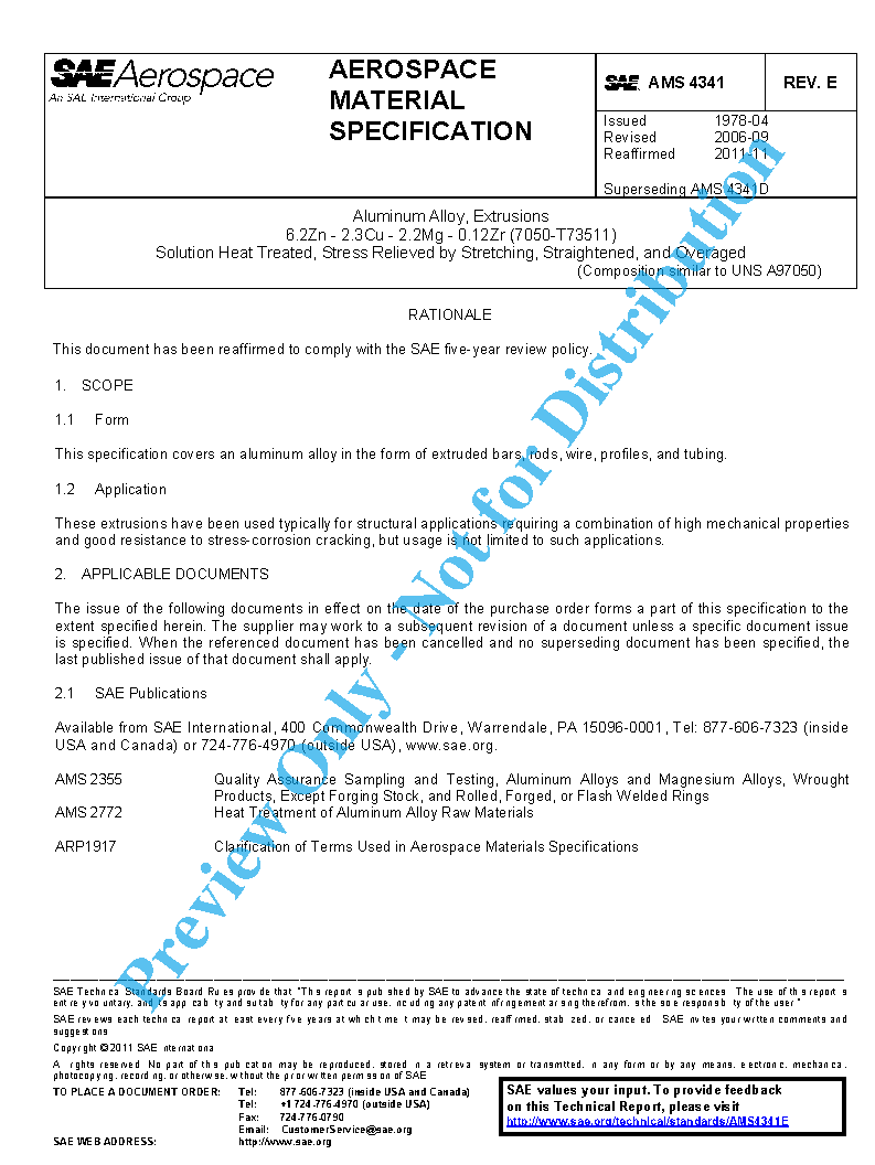 Aluminum Alloy, Extrusions 6.2Zn - 2.3Cu - 2.2Mg - 0.12Zr (7050-T73511) Solution Heat Treated, Stress Relieved by Stretching, Straightened, and Overaged