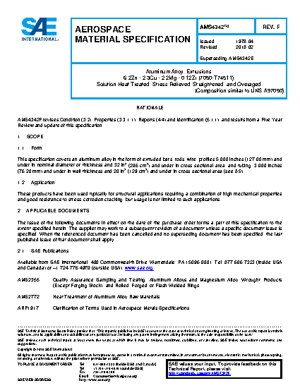 Aluminum Alloy, Extrusions 6.2Zn - 2.3Cu - 2.2Mg - 0.12Zr (7050-T74511) Solution Heat Treated, Stress Relieved, Straightened, and Overaged