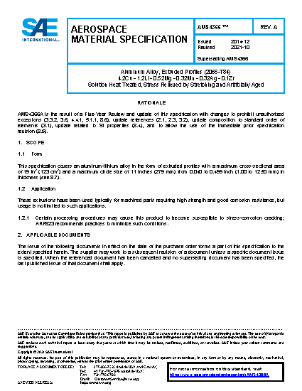 This specification covers an aluminum-lithium alloy in the form of extruded profiles with a maximum cross-sectional area of 19 square inches (123 cm2) and a maximum circle size of 11 inches (279mm) from 0.040 to 0.499 inches (1.00 to 12.50 mm) in thickness (See 8.5).