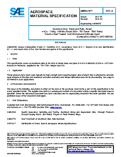 Aluminum Alloy, Sheet and Plate, Alclad 4.4Cu - 1.5Mg - 0.60Mn (Alclad 2024, -T81 Sheet, -T851 Plate) Solution Heat Treated, Cold Worked and Artificially Aged