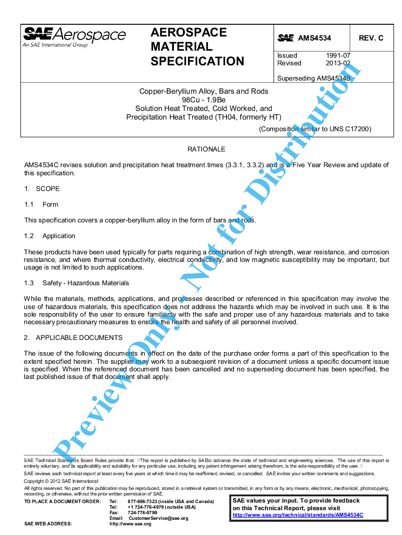 Copper-Beryllium Alloy, Bars and Rods 98Cu - 1.9Be Solution Heat Treated, Cold Worked, and Precipitation Heat Treated (TH04, formerly HT)