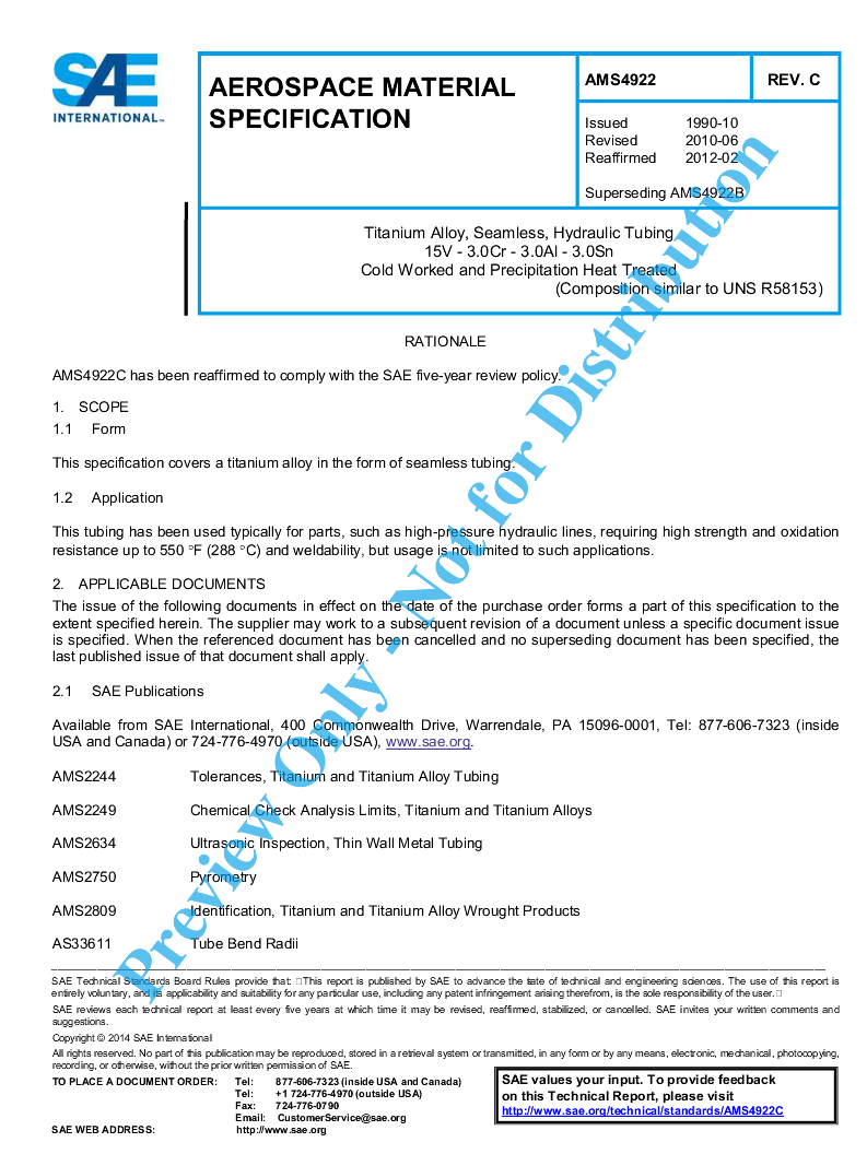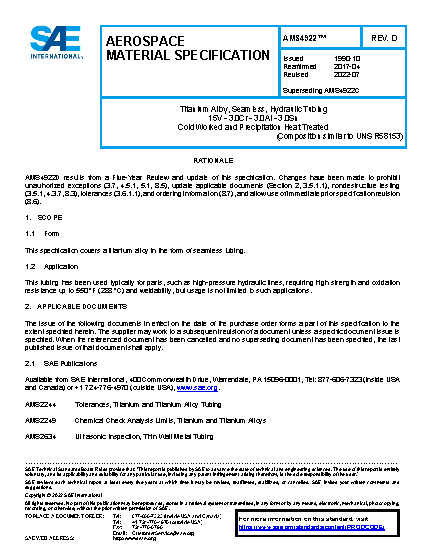 Titanium Alloy, Seamless, Hydraulic Tubing 15V - 3.0Cr - 3.0Al - 3.0Sn Cold Worked and Precipitation Heat Treated