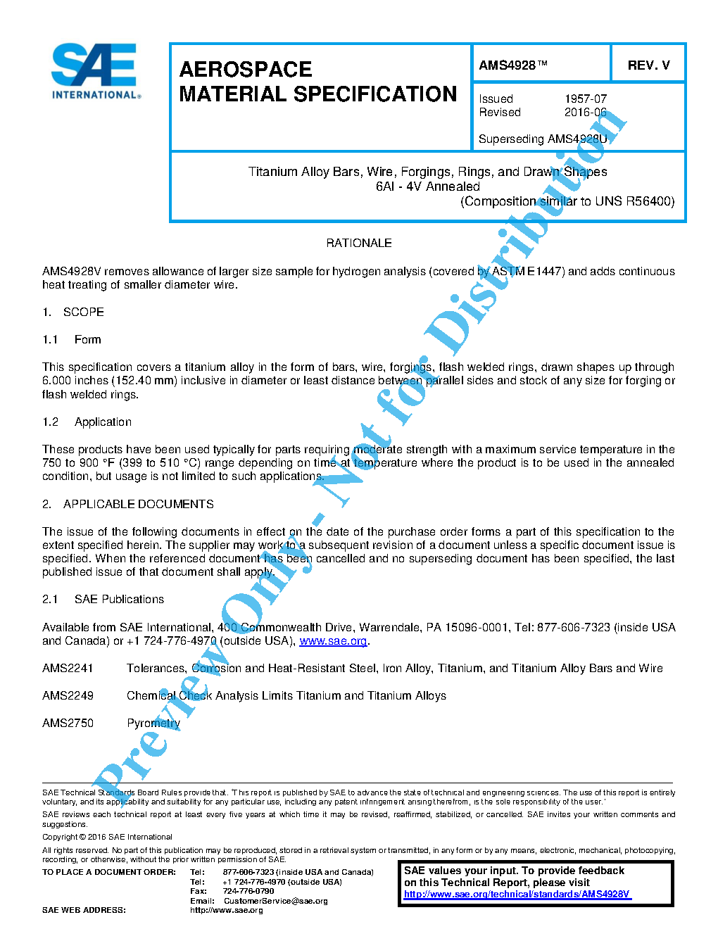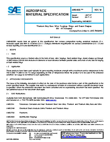 Titanium Alloy Bars, Wire, Forgings, Rings, and Drawn Shapes 6Al - 4V Annealed