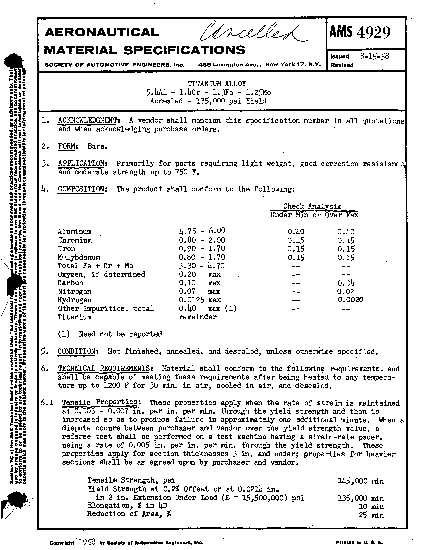 Titanium Alloy, 5.4al 1.4cr 1.3fe 1.25mo Annealed 135,000 Psi Yield