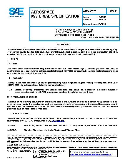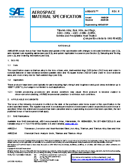 This specification covers a titanium alloy in the form of bars, wire, flash welded rings 3.00 inches (76.2 mm) and under in nominal diameter or least distance between parallel sides and 16 in2(103 cm2) and under in cross-sectional area and stock of any size for flash welded rings (see 8.4).