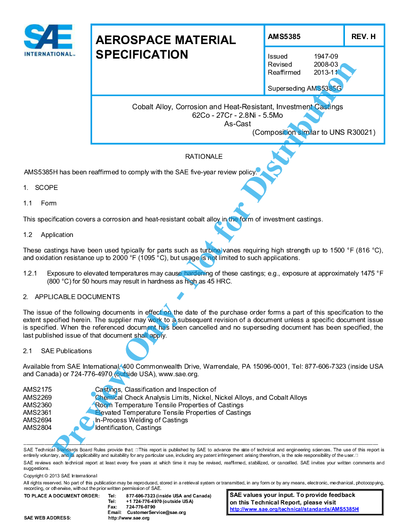This specification covers a corrosion and heat-resistant cobalt alloy in the form of investment castings.