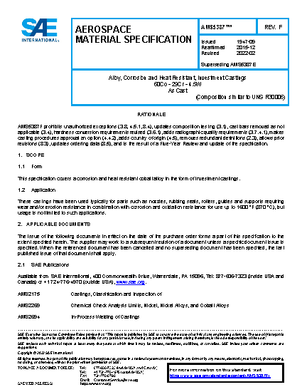 This specification covers a corrosion and heat resistant cobalt alloy in the form of investment castings.