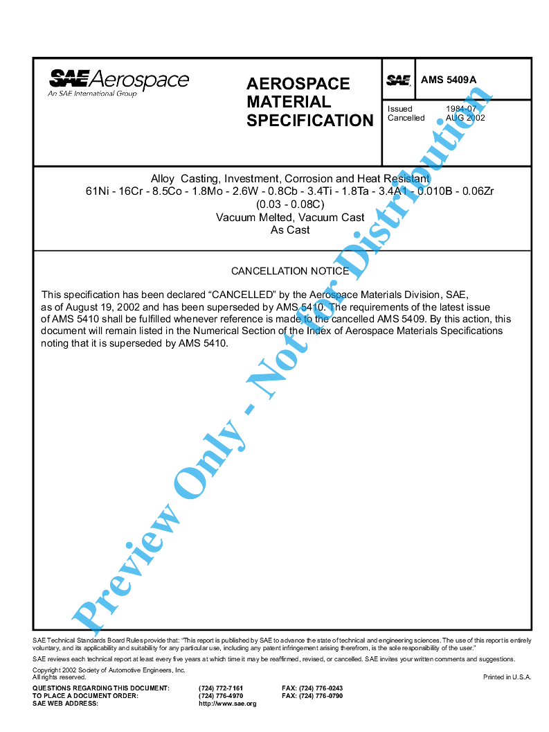 This specification covers a corrosion and heat resistant nickel alloy in the form of investment castings.