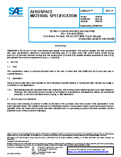Steel, Corrosion Resistant, Sheet and Strip 18Cr – 8Ni (SAE 30301) Cold Rolled, 185 ksi (1276 MPa) Tensile Strength