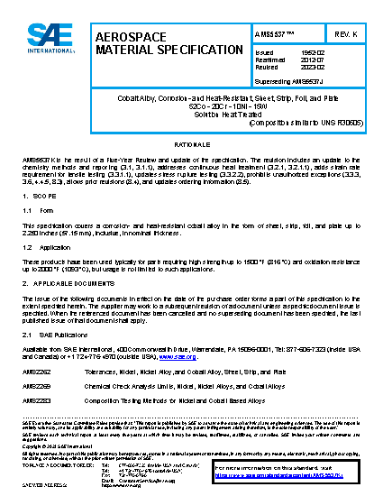 This specification covers a corrosion and heat-resistant cobalt alloy in the form of sheet, strip, foil, and plate up to 2.250 inches (57.15 mm) inclusive, in nominal thickness (see 8.4).