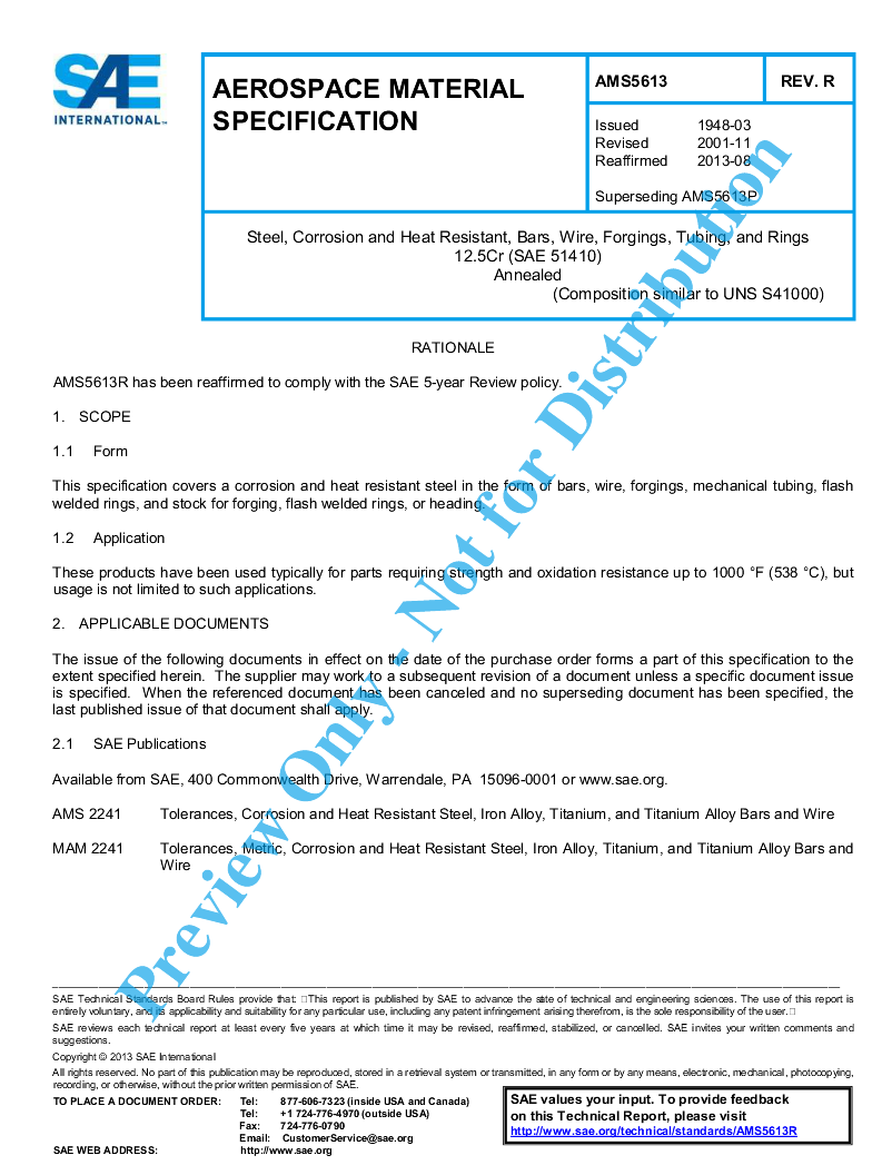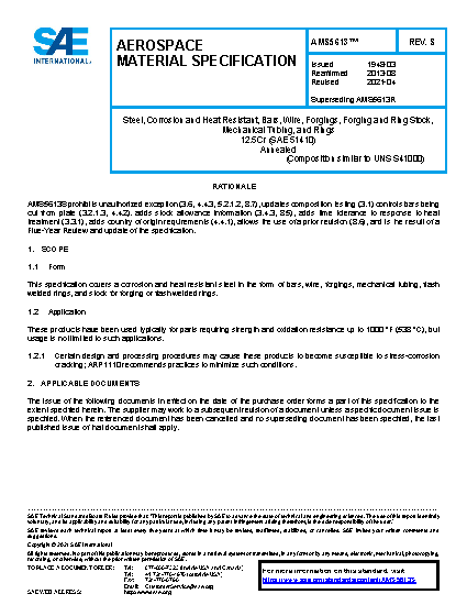 This specification covers a corrosion and heat resistant steel in the form of bars, wire, forgings, mechanical tubing, flash welded rings, and stock for forging, flash welded rings, or heading.
