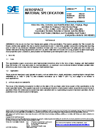 This specification covers a corrosion and heat-resistant nickel-iron alloy in the form of bars, forgings, and flash-welded rings 5.0 inches (127 mm) and under in nominal diameter, or least distance between parallel sides, and stock of any size for forging or flash-welded rings (see 8.6).