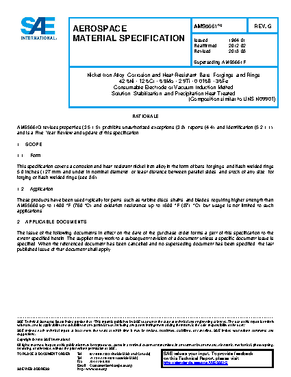 Nickel-Iron Alloy, Corrosion and Heat-Resistant, Bars, Forgings, and Rings 42.5Ni - 12.5Cr - 5.8Mo - 2.9Ti - 0.015B - 35Fe Consumable Electrode or Vacuum Induction Melted Solution, Stabilization, and Precipitation Heat Treated