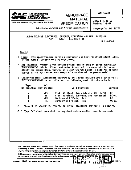 This specification covers a corrosion and heat resistant nickel alloy in the form of covered welding electrodes.