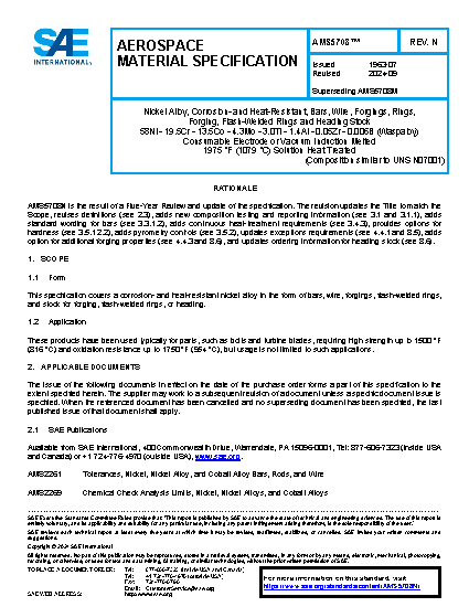 This specification covers a corrosion and heat-resistant nickel alloy in the form of bars, wire, forgings, flash welded rings, and stock for forging, flash welded rings, or heading.