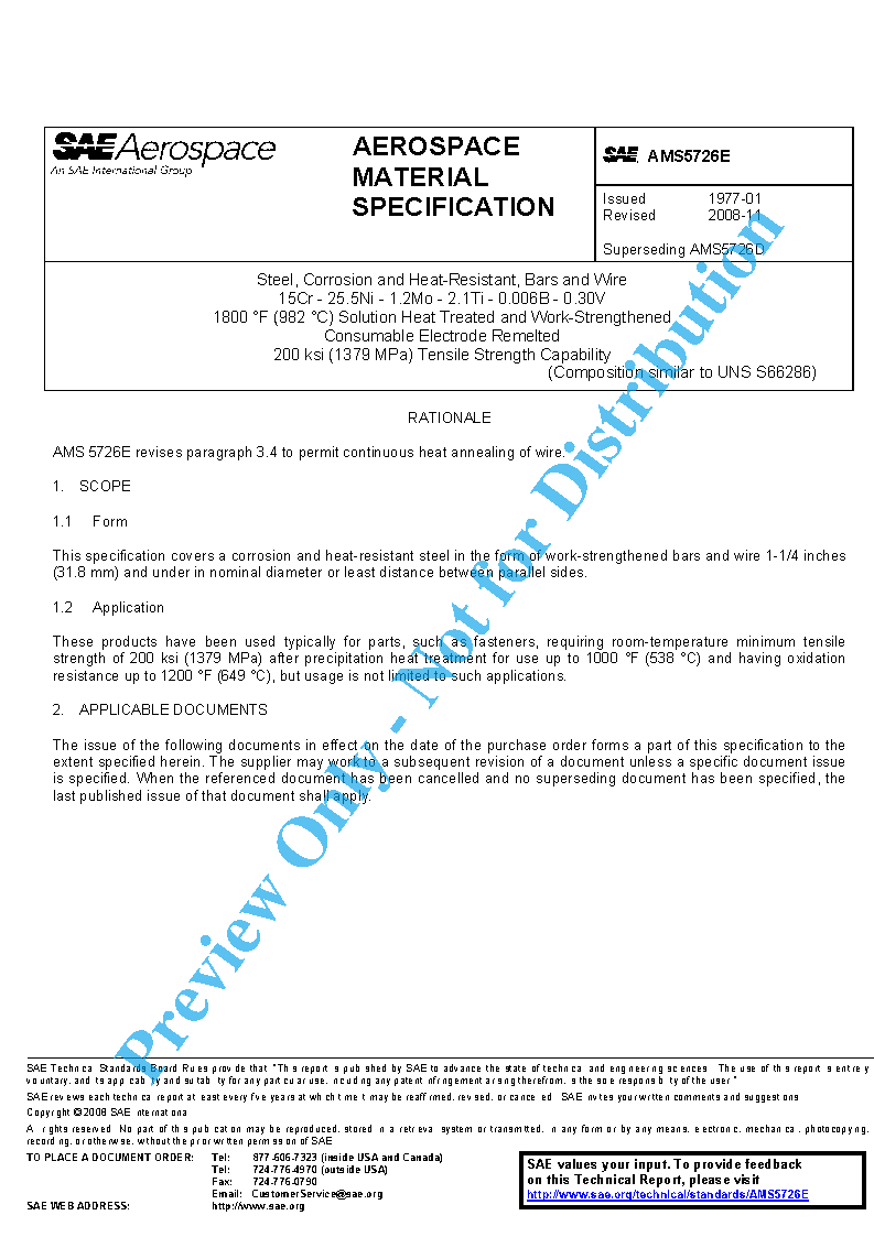 Steel, Corrosion and Heat-Resistant, Bars and Wire 15Cr - 25.5Ni - 1.2Mo - 2.1Ti - 0.006B - 0.30V 1800 °F (982 °C) Solution Heat Treated and Work-Strengthened Consumable Electrode Remelted 200 ksi (1379 MPa) Tensile Strength Capability