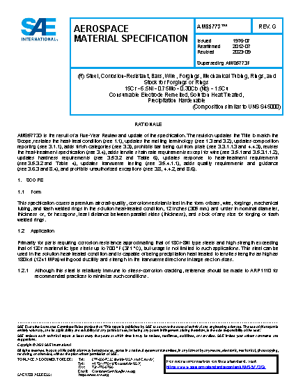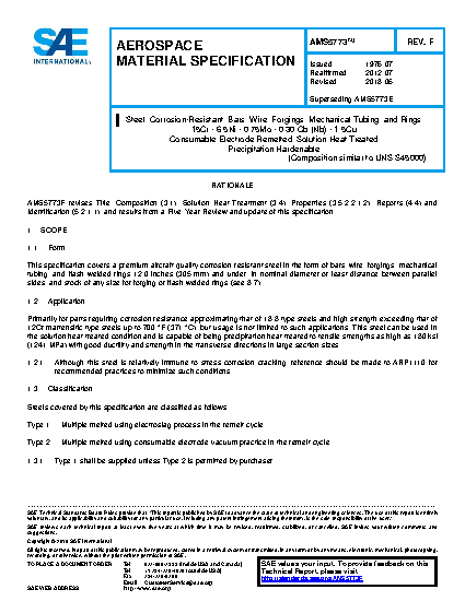 This specification covers a premium aircraft-quality corrosion-resistant steel in the form of bars, wire, forgings, mechanical tubing, and flash welded rings 12.0 inches (305 mm) and under, in nominal diameter or least distance between parallel sides, and stock of any size for forging or flash welded rings (see 8.7).