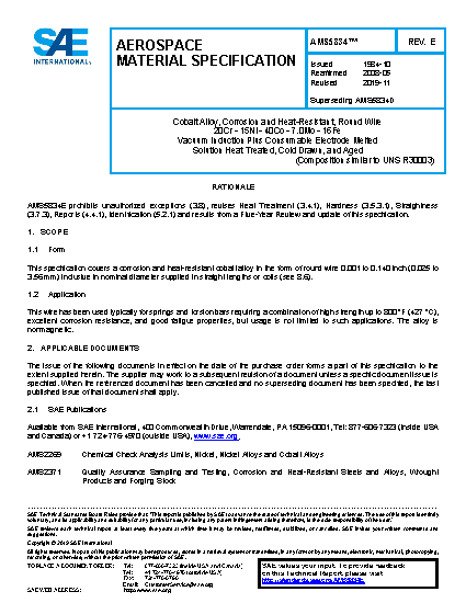 This specification covers a corrosion and heat-resistant cobalt alloy in the form of round wire 0.140 inch (3.56 mm) and under in nominal diameter supplied in straight lengths. (See 8.5.)