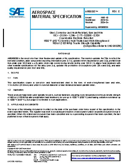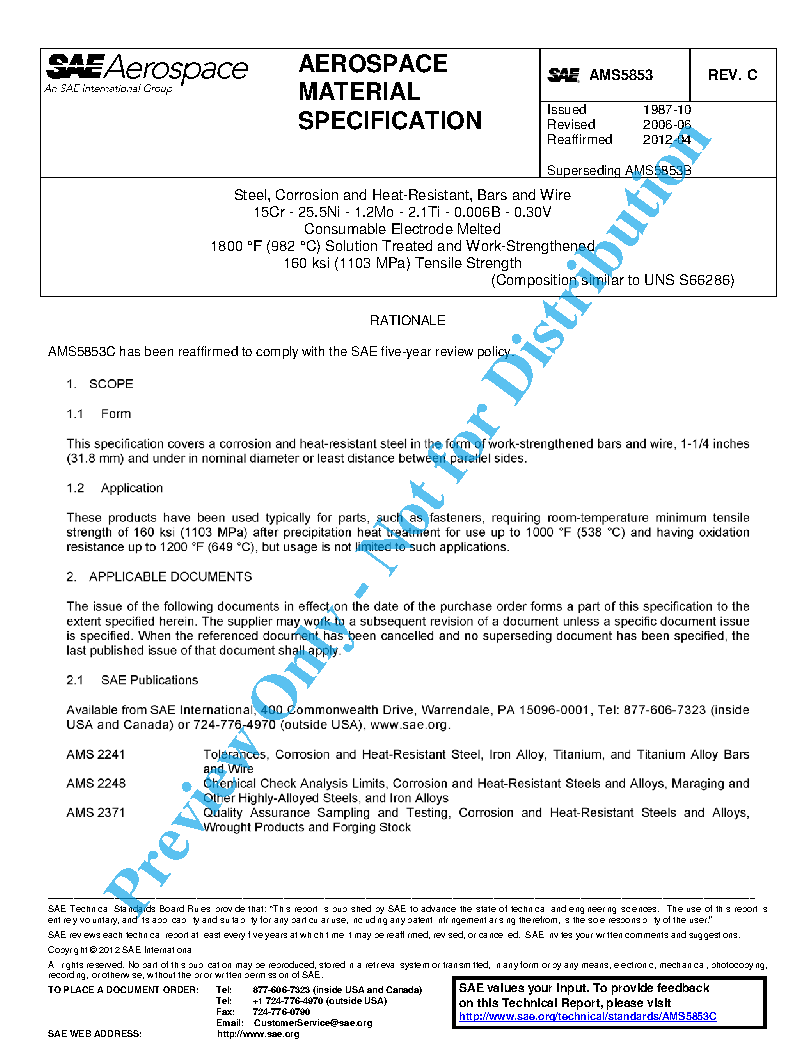 Steel, Corrosion and Heat-Resistant, Bars and Wire 15Cr - 25.5Ni - 1.2Mo - 2.1Ti - 0.006B - 0.30V Consumable Electrode Melted 1800 °F (982 °C) Solution Treated and Work-Strengthened Capable of 160 ksi (1103 MPa) Tensile Strength