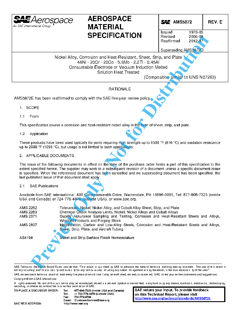 Nickel Alloy, Corrosion and Heat-Resistant, Sheet, Strip, and Plate 48Ni - 20Cr - 20Co - 5.9Mo - 2.2Ti - 0.45Al Consumable Electrode or Vacuum Induction Melted Solution Heat Treated