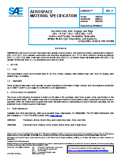 Iron-Nickel Alloy, Bars, Forgings, and Rings 42Fe - 37.5Ni - 14Co - 4.8Cb(Nb) - 1.6Ti Solution Heat Treated, Precipitation Hardenable Multiple Melted, High Temperature, Low Expansion