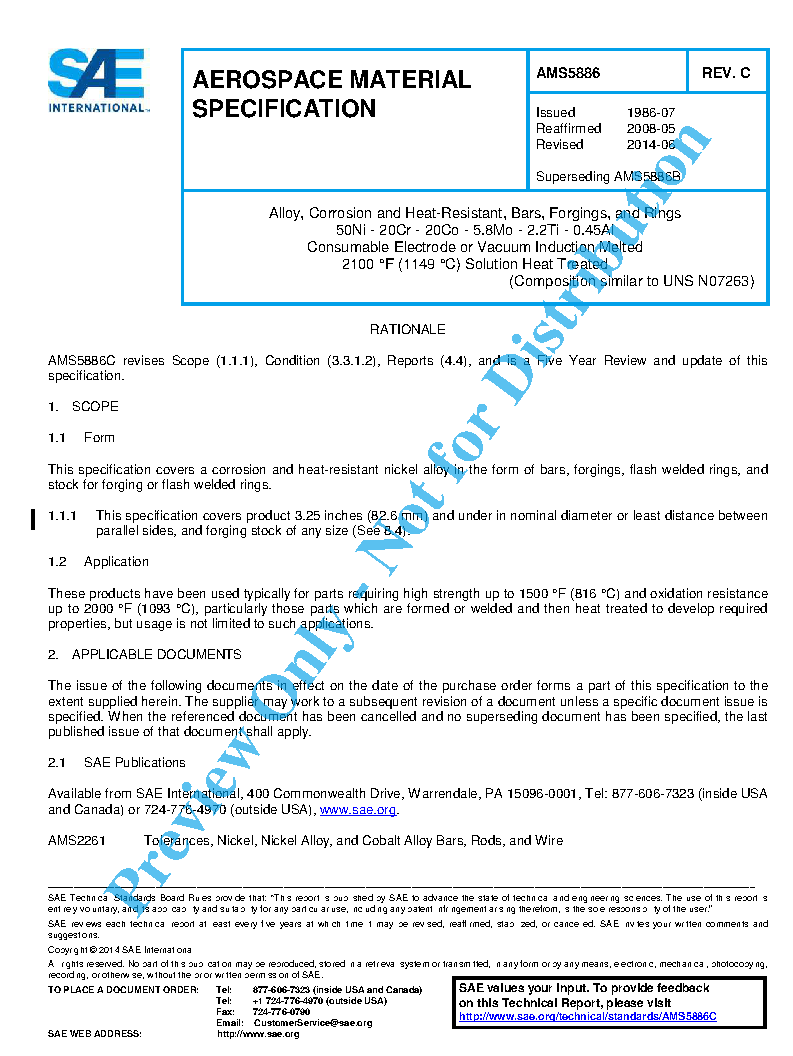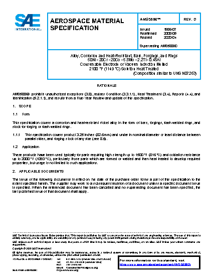 This specification covers a corrosion and heat-resistant nickel alloy in the form of bars, forgings, flash welded rings, and stock for forging or flash welded rings.