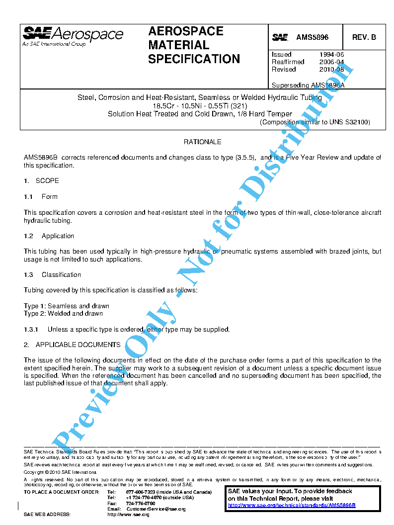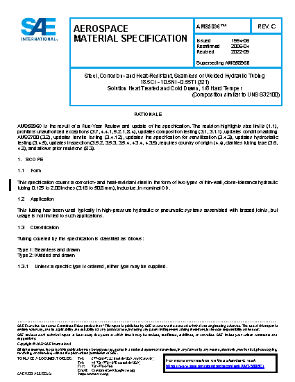 Steel, Corrosion and Heat-Resistant, Seamless or Welded Hydraulic Tubing 18.5Cr - 10.5Ni - 0.55Ti (321) Solution Heat Treated and Cold Drawn, 1/8 Hard Temper