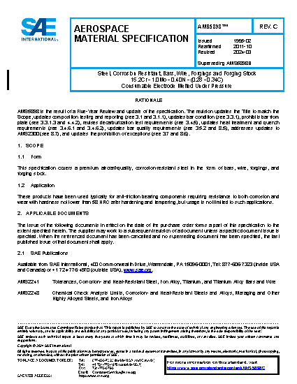 This specification covers a premium aircraft-quality, corrosion-resistant steel in the form of bars, wire, forgings, and forging stock.