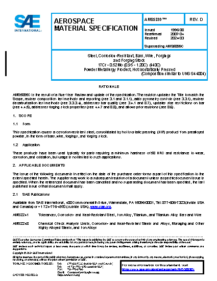 Steel, Corrosion Resistant, Bars, Wire, and Forgings 17Cr - 0.52Mo (0.95 - 1.20C) Powder Metallurgy Product, Hot Isostatically Pressed