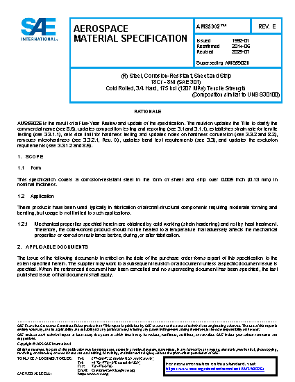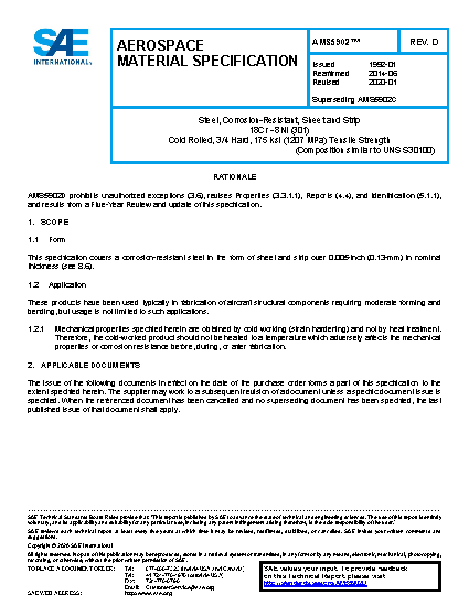 Steel, Corrosion-Resistant, Sheet and Strip 18Cr – 8Ni (SAE 30301) Cold Rolled, 3/4 Hard, 175 ksi (1207 MPa) Tensile Strength