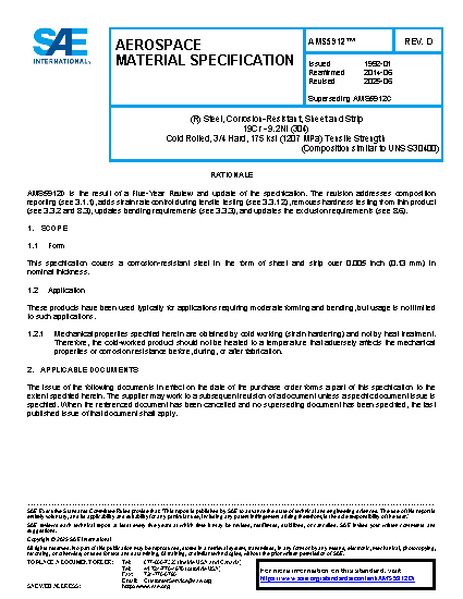 Steel, Corrosion-Resistant, Sheet and Strip 19Cr - 9.2Ni (SAE 30304) Cold Rolled, 3/4 Hard, 175 ksi (1207 MPa) Tensile Strength