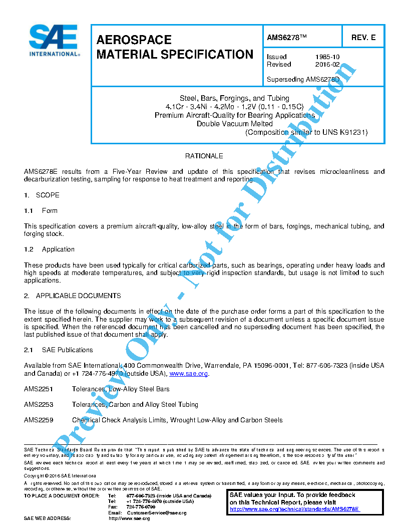 Steel, Bars, Forgings, and Tubing 4.1Cr - 3.4Ni - 4.2Mo - 1.2V (0.11 - 0.15C) Premium Aircraft-Quality for Bearing Applications Double Vacuum Melted